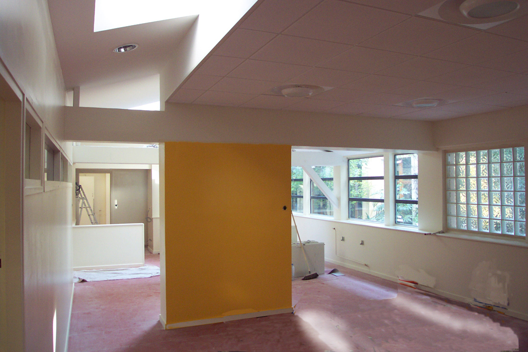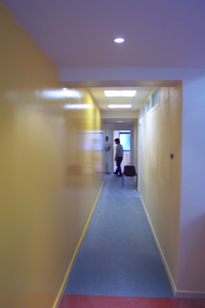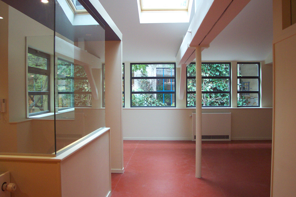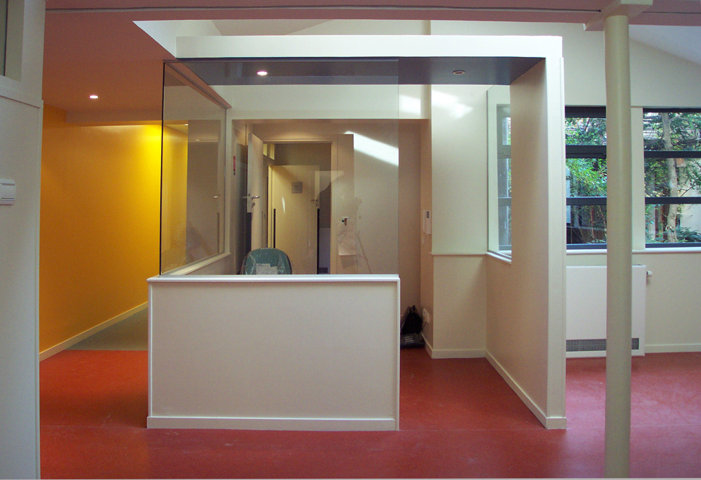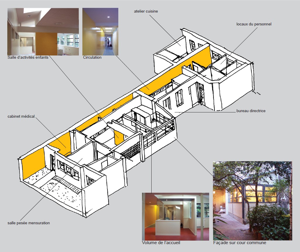 Le projet a permis de retrouver un bon fonctionnement par la suppression de rampes et de circulations qui consommaient beaucoup de surface inutilement. Ceci a été possible grâce à la réhausse du niveau général intérieur de la PMI de 60 cm, qui correspond à la hauteur du niveau d’entrée (boulevard de Ménilmontant). Les espaces sont traités de manière à relier visuellement entre eux les espaces accessibles au public et désenclaver la salle d’activités grâce à une large vue sur une cour commune fortement arborée. Le bureau d’accueil, situé comme une « boîte » dans le volume général sous le comble (récupéré à l’occasion du projet), articule l’espace ainsi créé entre la partie administrative et celle des locaux accessibles au public ; ce petit local joue sur ses possibilités d’ouverture et de fermeture.