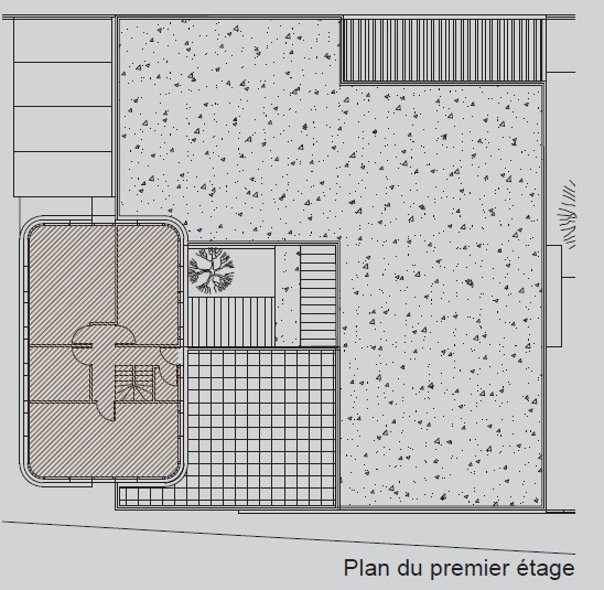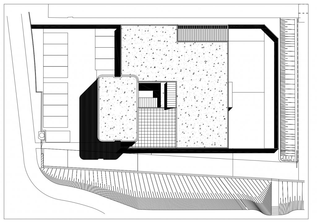 Au sein même de la parcelle, les voitures longent le bas du terrain, jusqu’au parking. Un accès de service est défini depuis celui-ci desservant le bâtiment administratif.