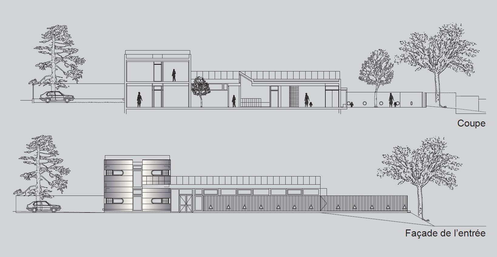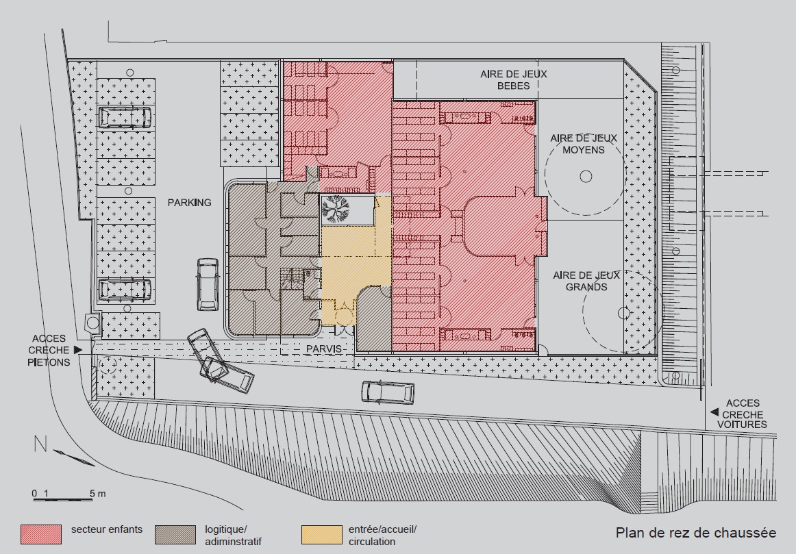 Il s’agit d’un équipement de la petite enfance de 55 berceaux. Les espaces destinés au public sont tous en RDC et implantés à une même côte. Une partie du batiment est à R+1. Il s’agit de la zone non accessible au public. Ce « plot » est traité tel un signal (visible depuis la RN) et il protège les espaces des enfants des nuisances sonores.