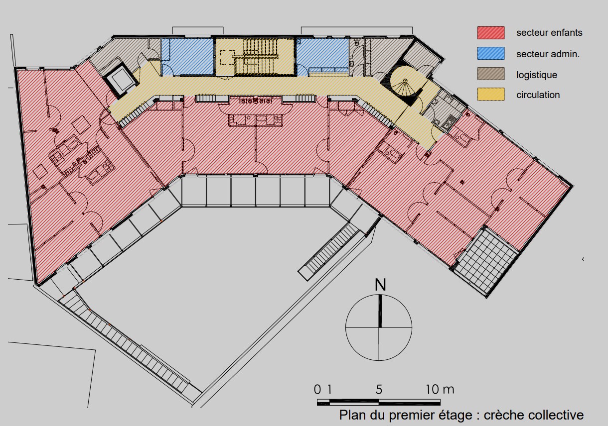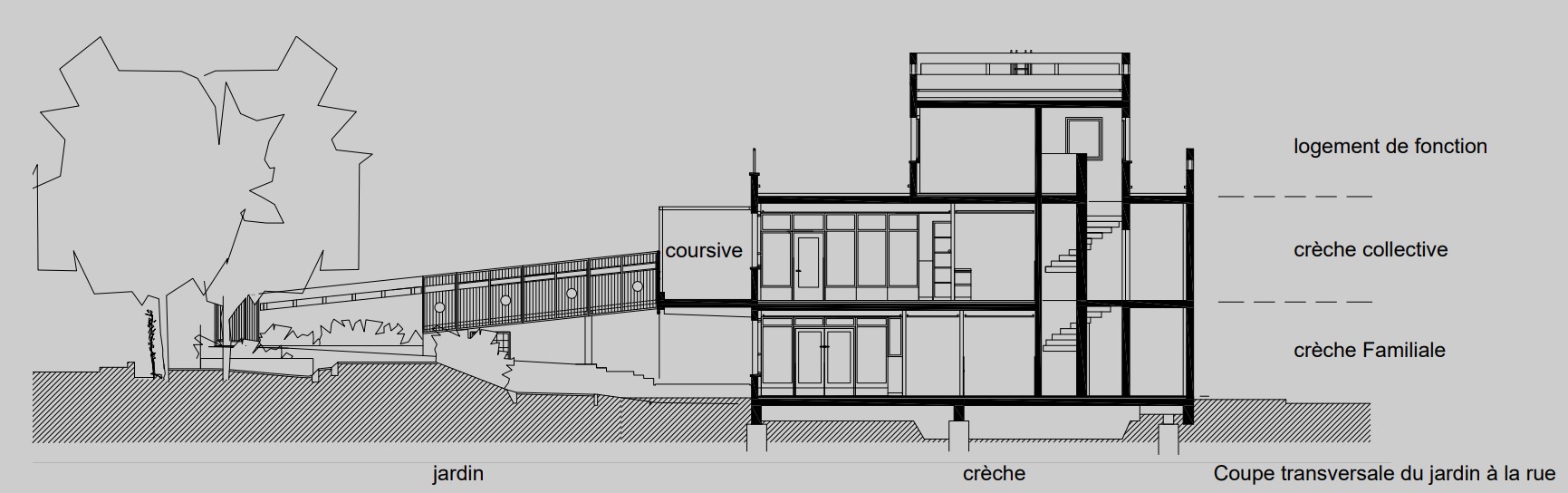 La crèche collective, la crèche familiale et le logement de fonction sont organisés au sein d’un bâtiment R+2.