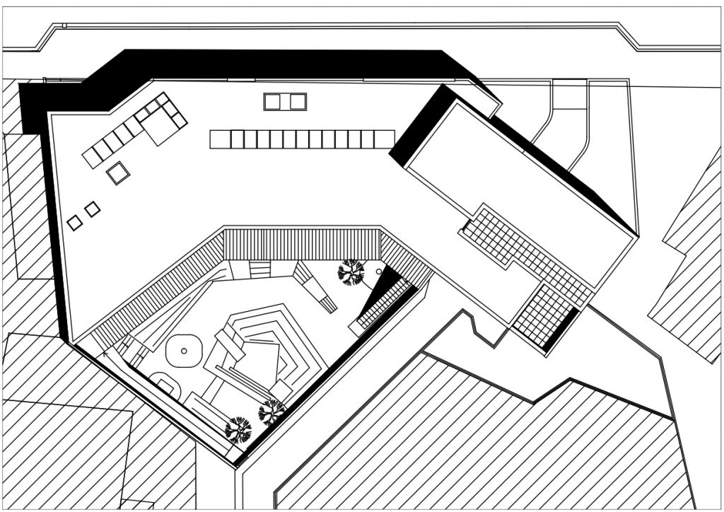 Sur rue : rehaussement des façades en maçonnerie de 1 mètre pour hiérarchiser les volumes, et alignement avec les garde-corps de sécurité de la terrasse. Création de auvents au dessus de chaque entité. Utilisation de la couleur afin de les identifier : jaune et magenta pour les deux crèches, blanc pour le logement.