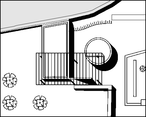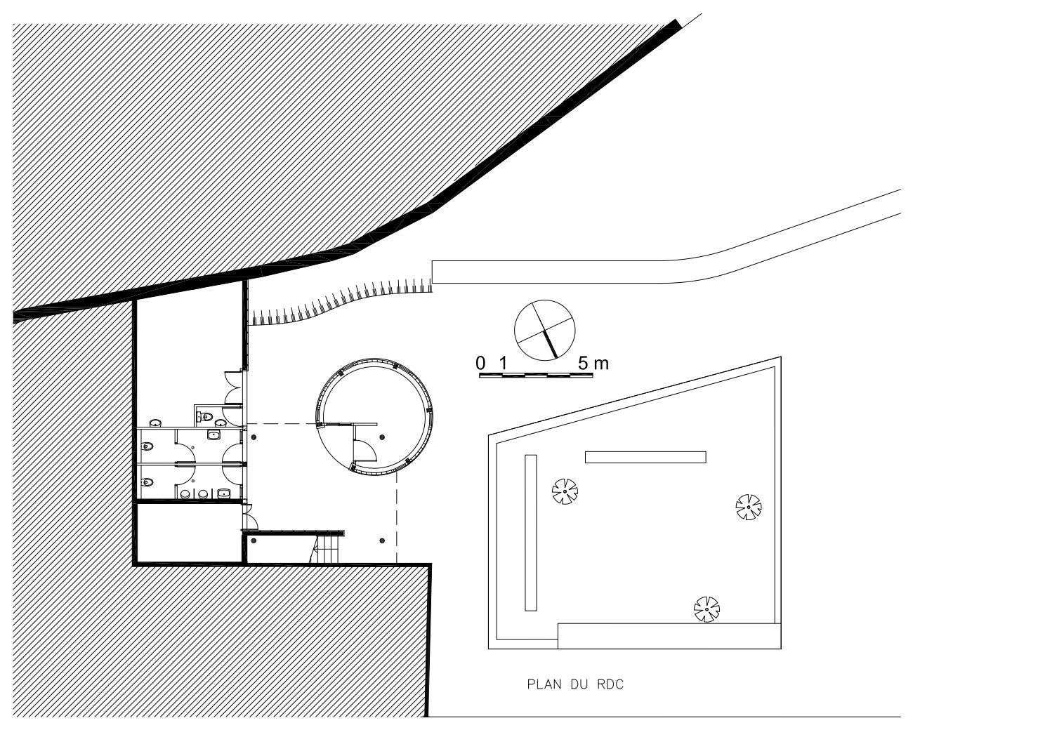 • le second volume, cylindrique, est destiné au gardiennage du jardin. Sa disposition offre au gardien une vue panoramique sur le jardin. La sur-toiture est traitée comme une pergola, qui permet d’articuler les différents niveaux de sol, et de faire le lien entre les volumes