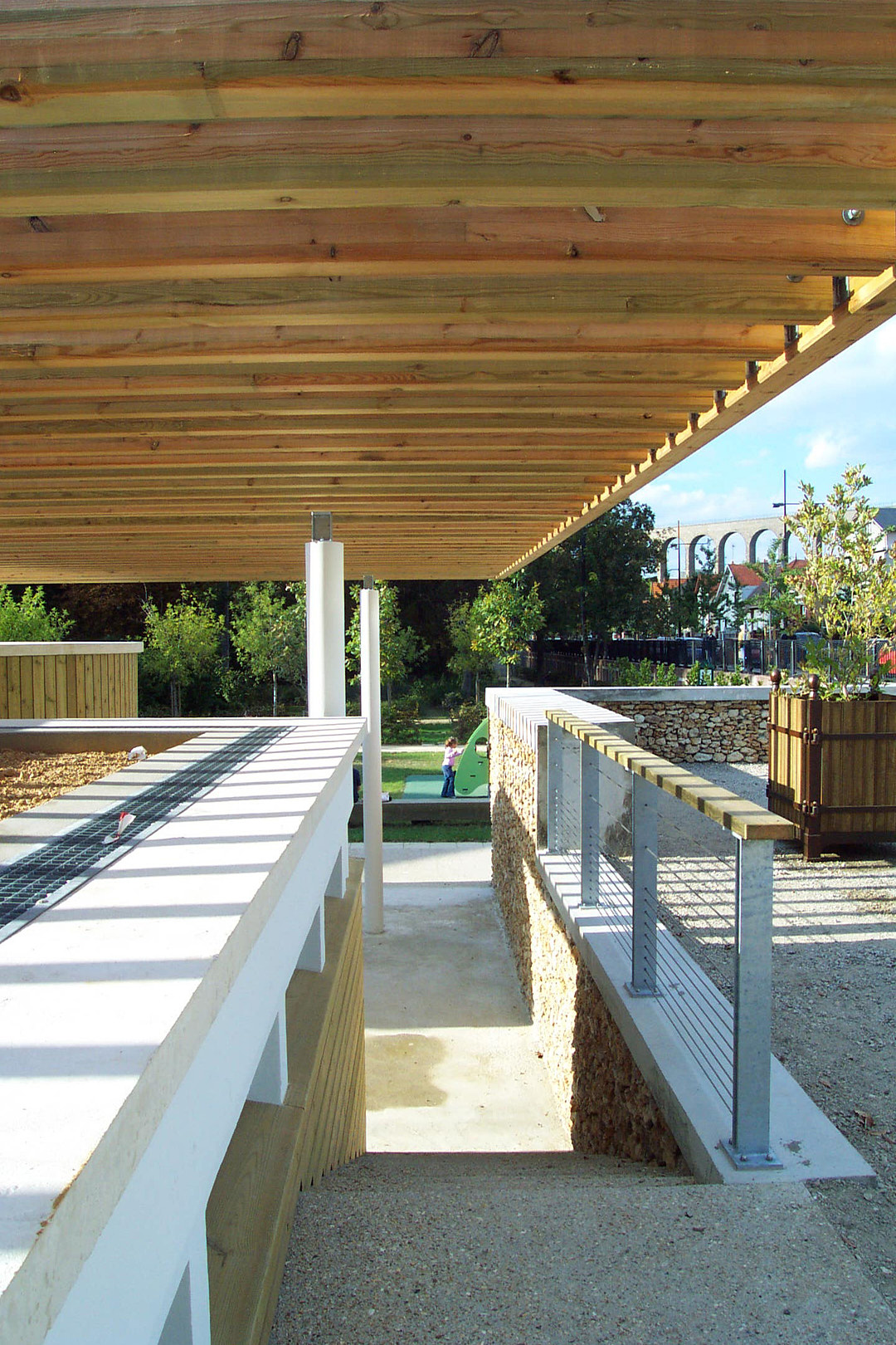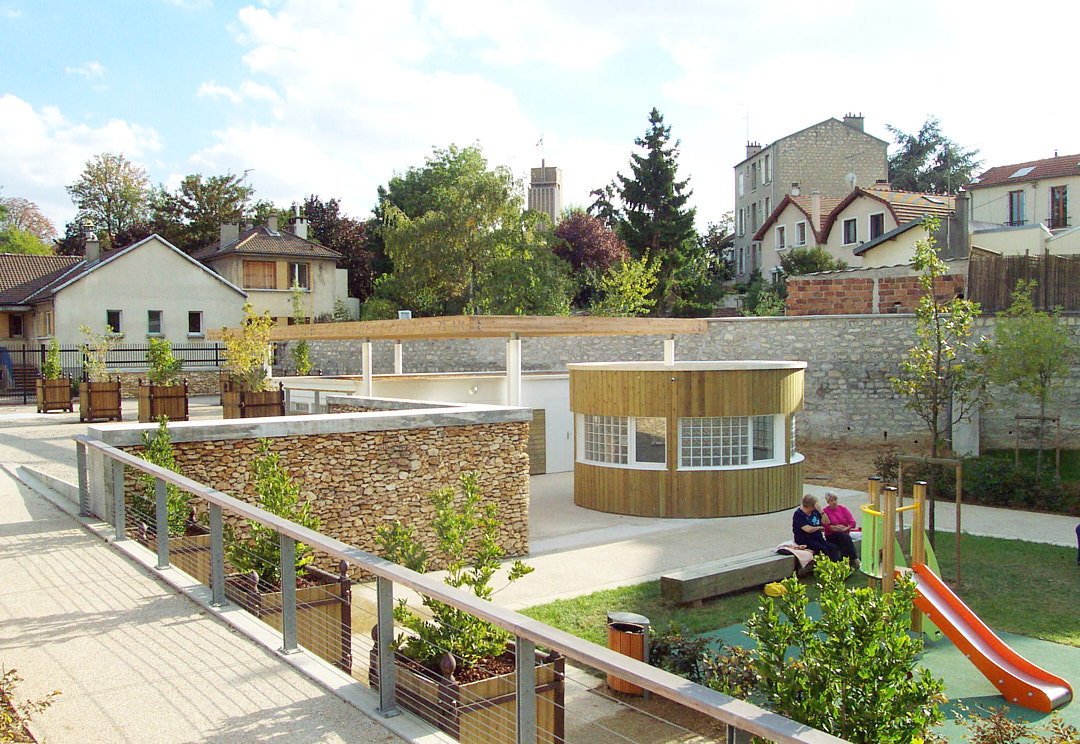 Les locaux s’inscrivent dans un projet global d’aménagement du parc. On accède au jardin par une plate-forme en balcon, à 1.5 mètre au dessus du parc. Seule la partie supérieure du projet sera donnée à voir depuis l’entrée. Depuis la rue, le bâtiment reste donc discret, tout en étant repérable depuis le jardin, ceci afin de répondre à sa fonction d’accueil.