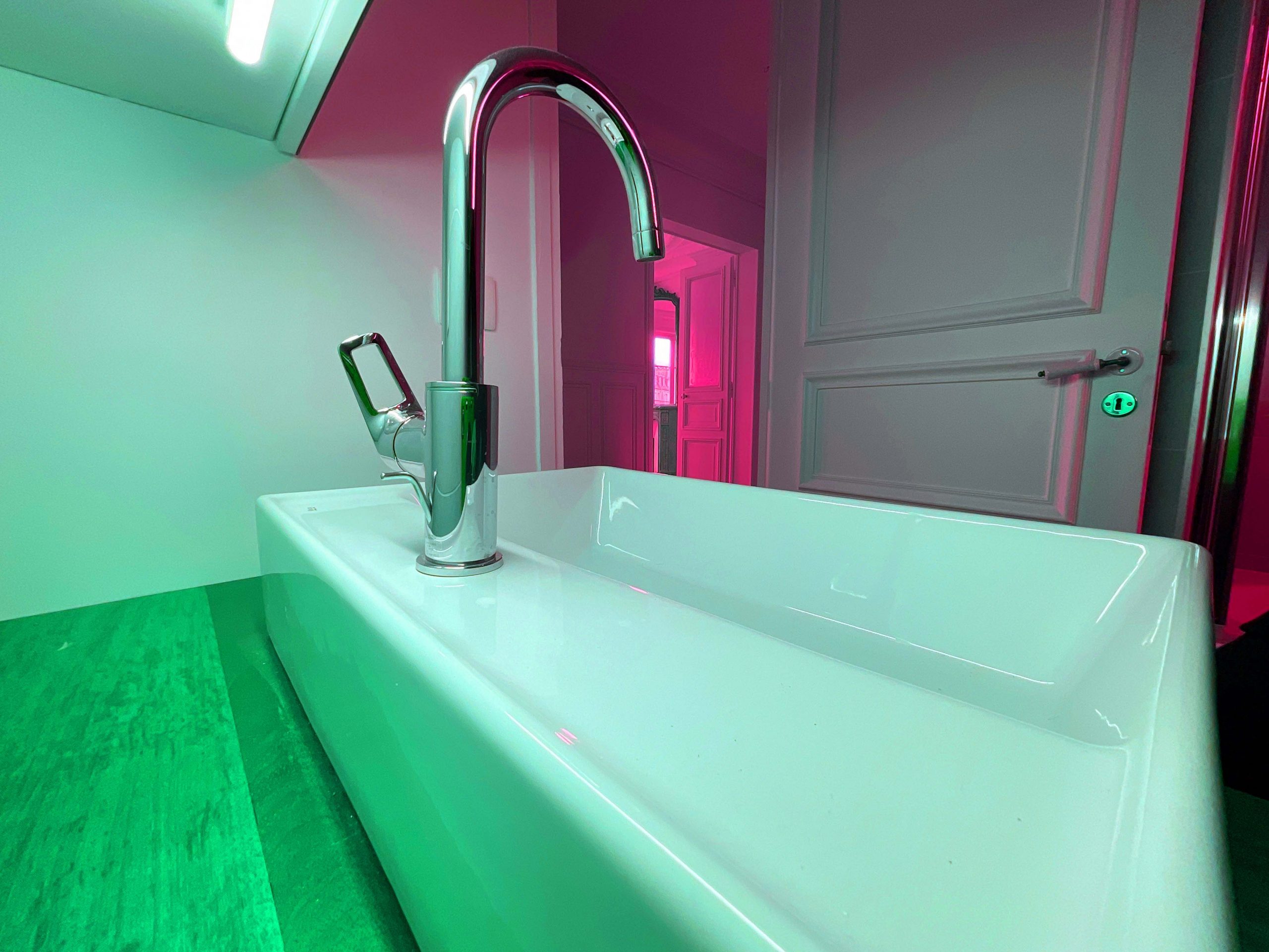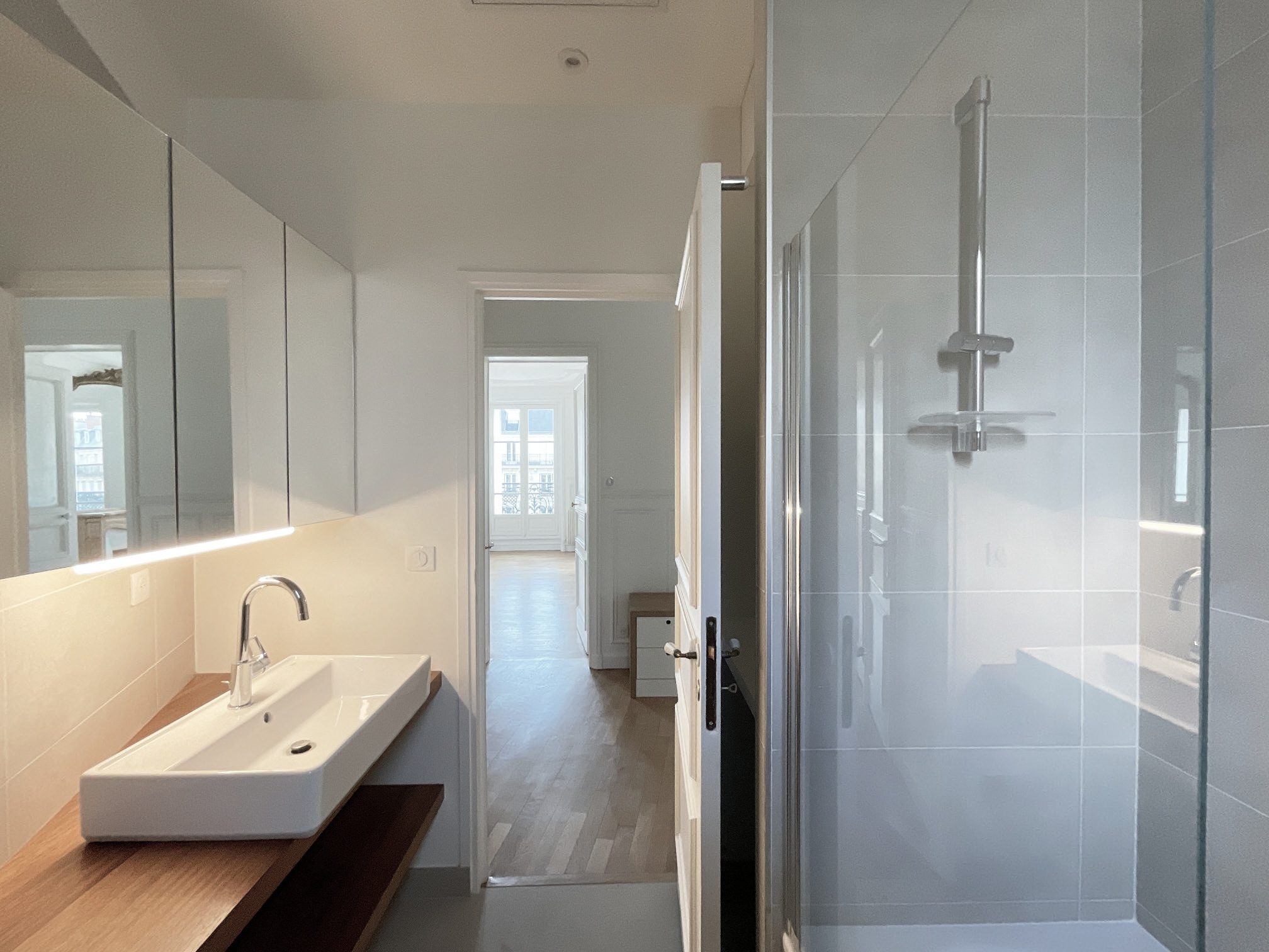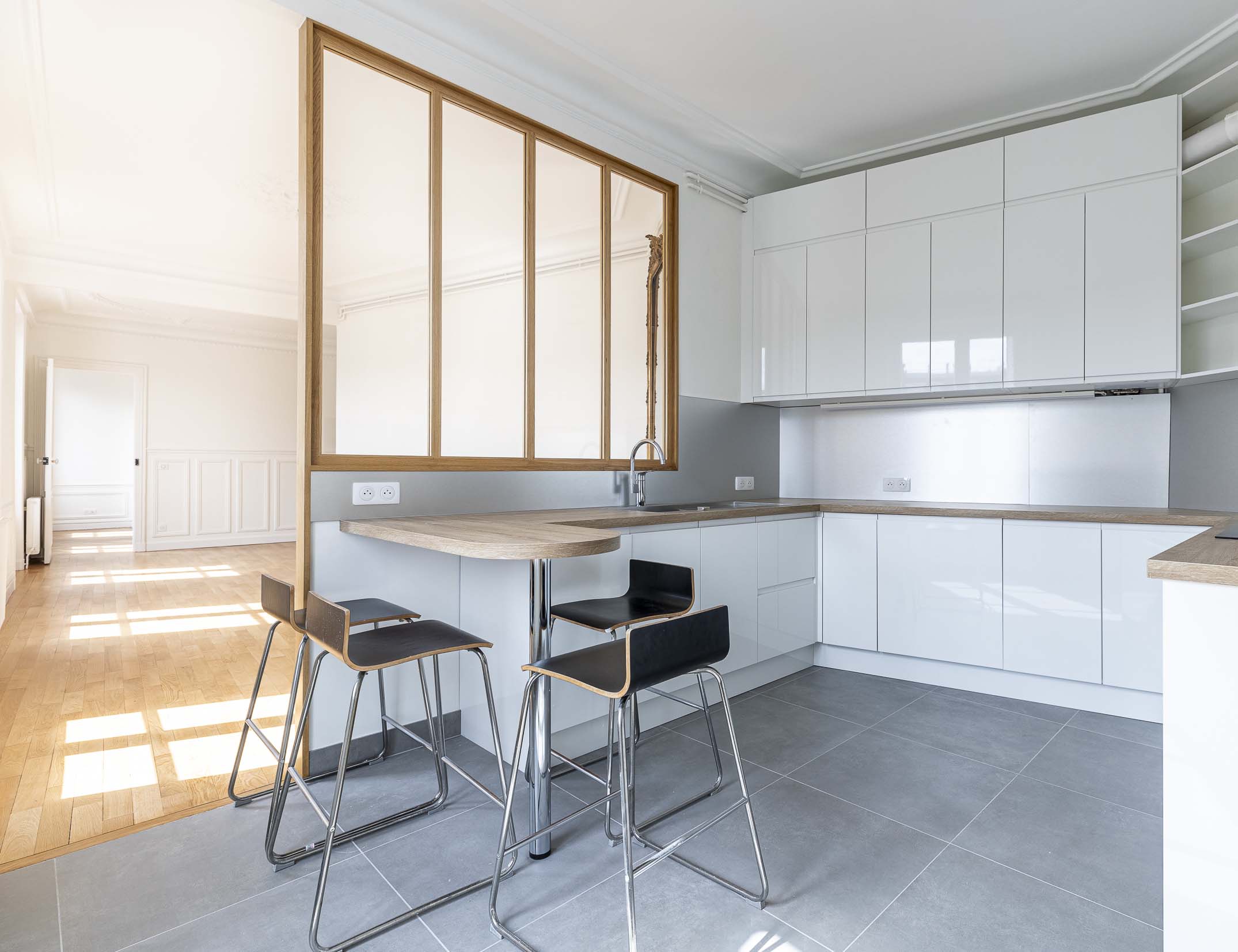 – Meubles aspect laqués blancs, plan de travail en bois et verrière « atelier » créent un espace lumineux et chaleureux, cohérent avec l’ensemble de l’appartement (parquets bois, murs blancs).
