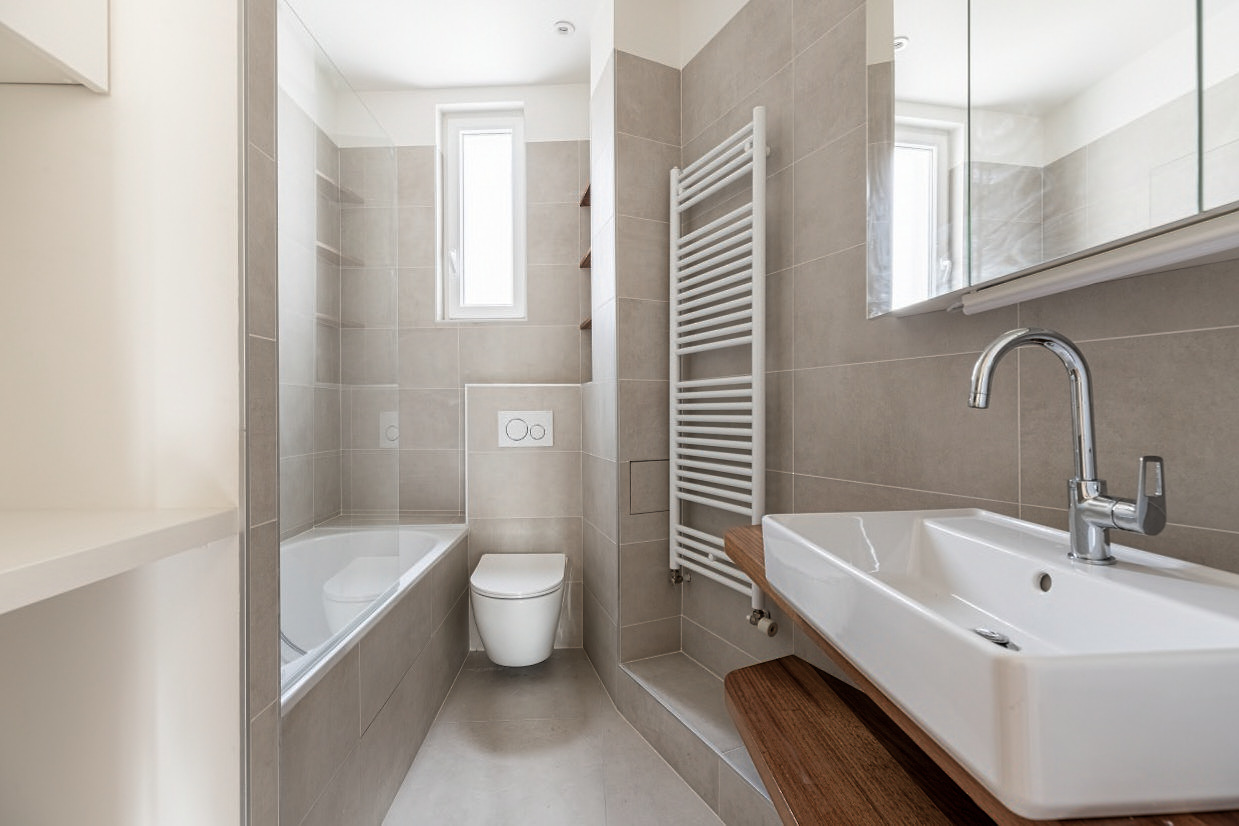 Pensée pour le confort urbain, cette salle de bain contemporaine combine baignoire vitrée, WC suspendu, vasque en céramique et miroirs intégrés. Revêtements muraux, plan support de vasque, mobilier, l’ensemble est traité de manière homogène dans des tonalités naturelles.